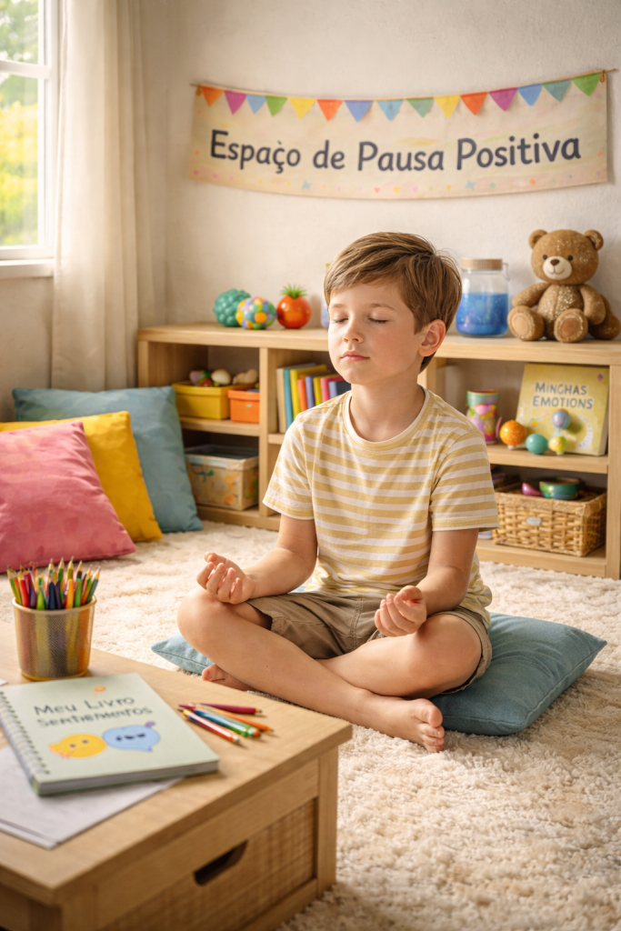 É um espaço estruturado para a criança se reorganizar emocionalmente. Não envolve telas (um desafio desta geração), nem brinquedos que distraiam do processo. Pode incluir livros, papel e lápis para escrever ou desenhar sentimentos. Para os pequenos, pode ser um espaço acolhedor, com almofadas e objetos calmantes — sempre com intencionalidade pedagógica.