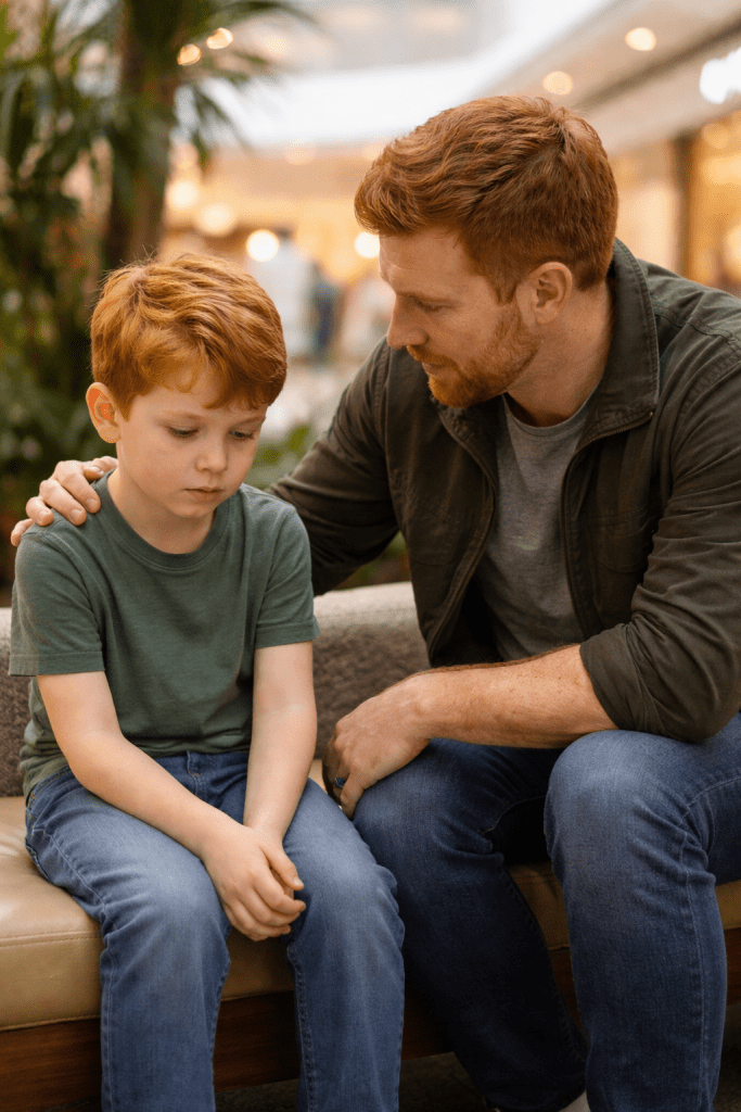 Se a crise estiver muito intensa, Augusto pode levar Joca para um espaço mais tranquilo — fora do centro do movimento — para que ele se reorganize.