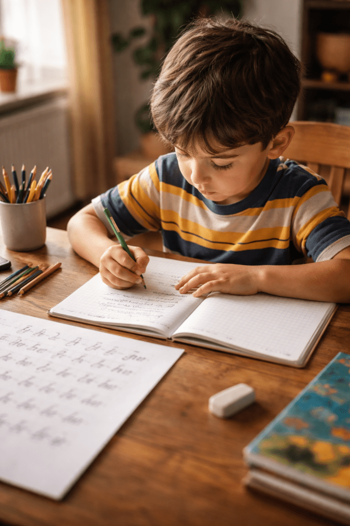 Ao copiar um texto, a criança observa a estrutura das palavras, a pontuação, o uso de letras maiúsculas e a organização das frases. Ela treina o olhar e o traço ao mesmo tempo.